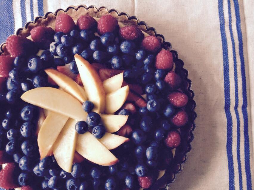 Eat at a Table After some discussion of the menu, we decided to leave the main course to Franco. Wheph. And so, I was off the hook and didn’t have to offer up my crock-pot American Chop Suey. My marching orders were simple: set the table, make dessert. Easy. I could handle that. In fact, desserts are my speciality. When I was young I spent hours with my grandmother, who was a Pennsylvania Dutch baker, helping her make apple pies, apple dumplings, shoofly pies and funnel cakes in her tiny kitchen in Ambler, PA. We’d load up her stationwagon early in the morning and haul all that goodness down to Union St. in Medford where she and my dad’s second wife Jenifer ran a little bakery called The Upper Crust. Whipping up a fruit tart with a buttery flaky crust was in my genes. And because it was summer, peaches and blueberries were still relatively easy to find at a NJ Farmer’s Market.