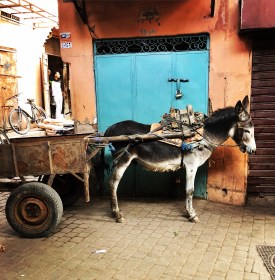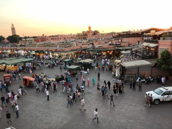 So? Where do I begin? Jemaa-el Fna is Marrakech’s center square in the medina, which, at the southwest corner stands the Kutubiyya (Koutoubia) Mosque. If Times Square is a feast for the eyes, Jemaa-el Fna is a feast for all your other senses. Competing smells of kefta, couscous, chicken, nuts, spices, and oranges. The sounds of African drums, Moroccan flutes, castanets, whirling Sufi music. A horse-drawn carriage, snake charmers, belly dancers, animals, French, Arabic, Spanish, English, and people everywhere, everywhere imploring you to come into the souks and buy their wares, go on a tour, see the sights, book their hotels… A bit stunned, it was about then our porter, Hassan, found us and quickly whisked us away to the “safety” of our new riad. But I didn’t want to be safe. I wanted to be mad. Jack Kerouac once wrote, “[…]the only people for me are the mad ones, the ones who are mad to live, mad to talk, mad to be saved, desirous of everything at the same time, the ones who never yawn or say a commonplace thing, but burn, burn, burn like fabulous yellow roman candles exploding like spiders across the stars and in the middle you see the blue centerlight pop and everybody goes “Awww!” That’s Jemaa-el Fna. Beautiful, exploding, mad. I had finally made it here, and I didn’t want to miss anything.
