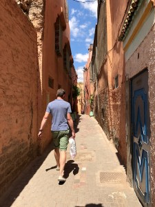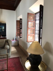 After we dumped our bags in our room, and sprawled out in the living room, Doug on the sofa, me at the desk, we both kind of went through that giddiness of newly arriving somewhere. Looked in closets, opened windows, jumped on the bed, ate the cookies. And definitely explored the courtyards, pool area and rooftop. The El Cadi is really five houses that share two main courtyards and each courtyard has three or four stairways, so it can get seriously confusing. By the end of a three-night stay we should have our bearings. The space in our actual apartment is grand. And, if I could rent this place for three months straight, I would. Every year. It’s truly a dream property. Stone tile floors, a living room with windows that open on each side, a separate bedroom that looks out over an interior courtyard pool, a shower room, and a toilet room. There are hundreds of fabulous places to stay in Marrakech, many far more opulent. But, this place. Uff. The best.