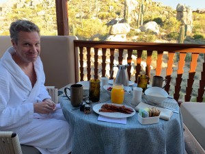 We arrived rather late last night, almost 10pm. It’s a 40-minute drive from Phoenix Sky Harbor to Scottsdale and while exhausted and still fending off my migraine, I was once again blown away by the Four Seasons. Our room is small but we have a super cute terrace overlooking the Sonoran landscape and all the great amenities that make this place five-stars. I got up early, as always, to write and did so outside on the deck. I watched the sunrise behind me turn the hills before me a beautiful yellowy-orange, and inspired by the views I woke Doug up with a coffee from the cafe.