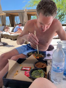 We had poke bowls and detox drinks right in our little cabana–Doug had a prickly pear margarita–and then we stumbled down the desert path in the blazing noontime sun back to the room to rest from all that rest. Doug instantly fell asleep. I showered, put on my street clothes and went over to Proof, at the hotel, for an afternoon coffee. When I came back we managed to find the energy to head to Old Town Scottsdale, a very kitschy, slightly has-been tourist spot of a few streets of Native American “trading posts,” art galleries and restaurants. We found no T-shirt’s and I bought nothing except a ring.