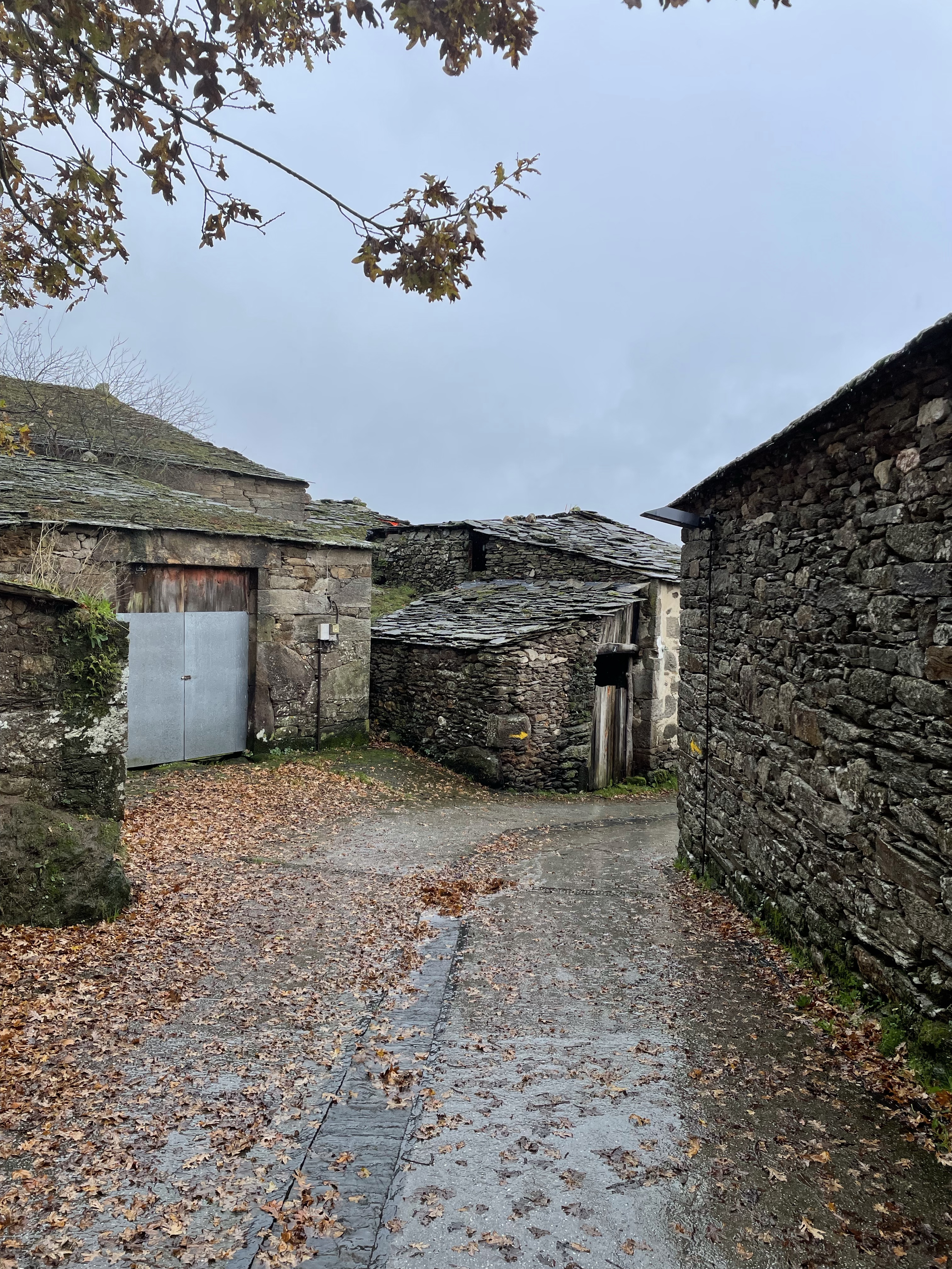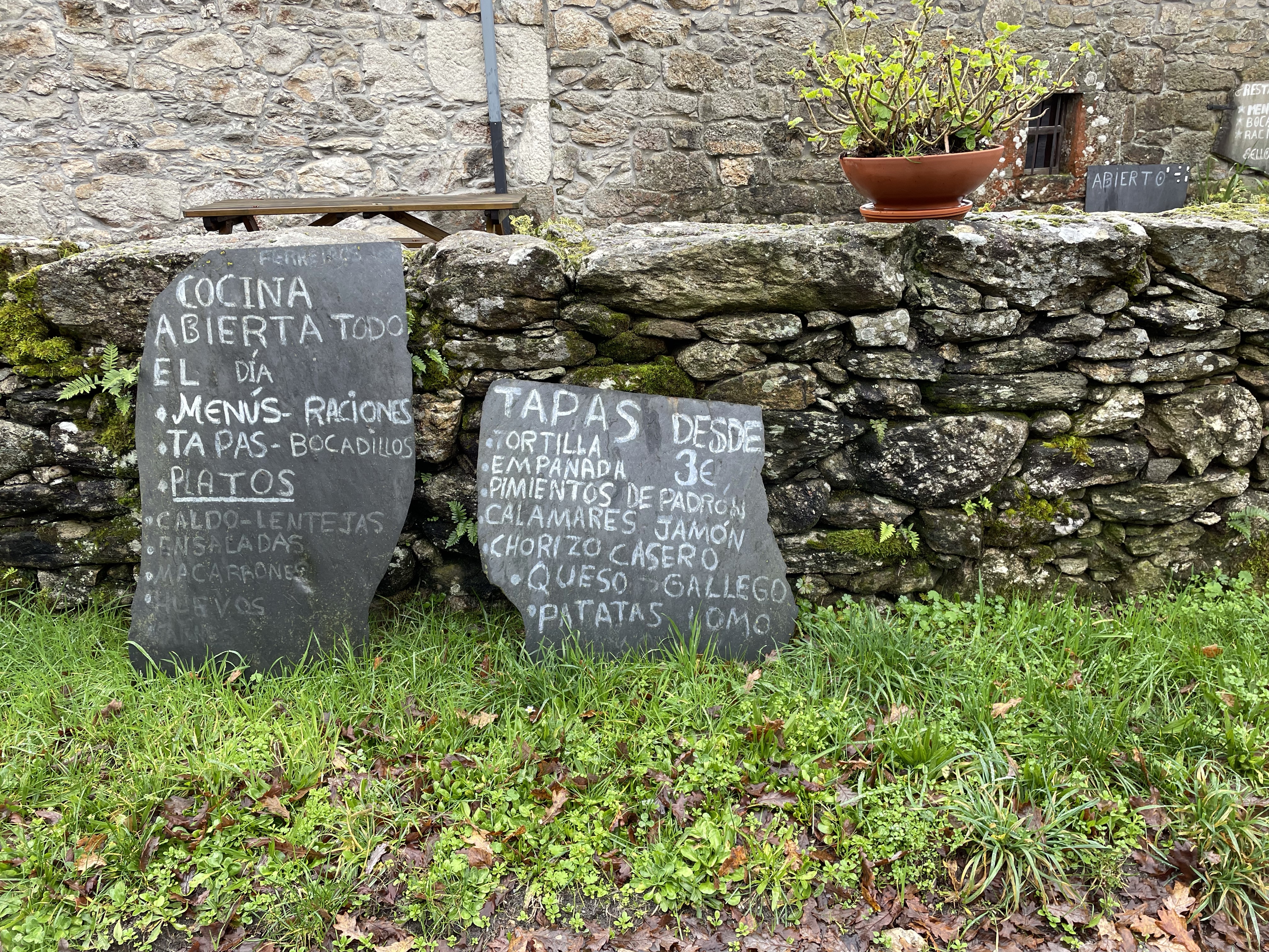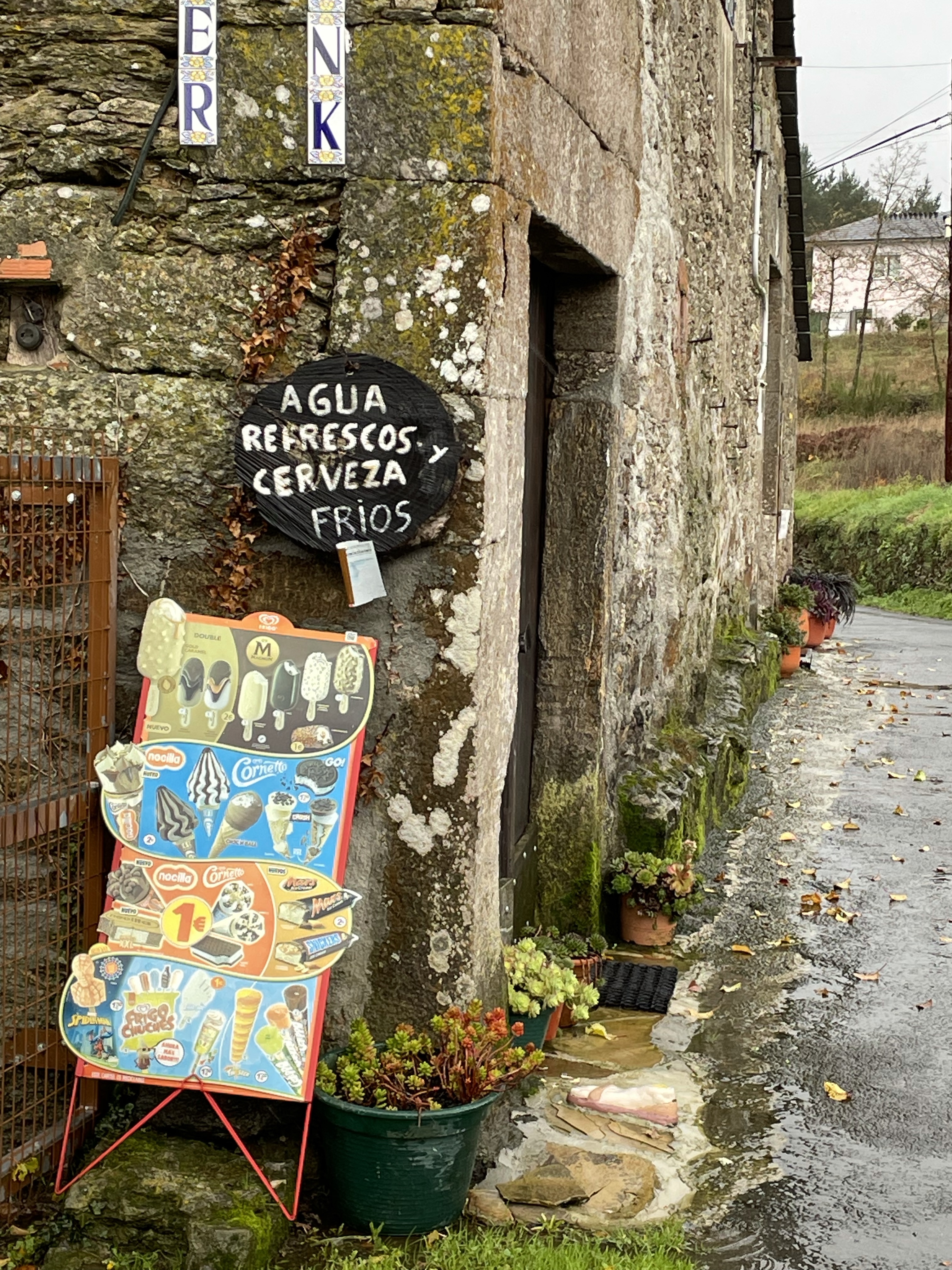 By 2pm, ish, I made it to Bodega Perez, the only place open for lunch in the entire town, except for a pizza place. There were other hikers here as well. We nodded in solidarity and then I ate like a fiend. I had passed so many potentially cute rest stops and restaurants and tiendas, all with alluring signs that said: “Pilgrims welcome,” and “Descanso,” only to be sadly taped over with another sign that said, “Closed for personal reasons.” (You mean, closed because it’s miserable out?). The promise of food, bathrooms or rest does not exist in winter. Fellow pilgrims: plan accordingly. And by all means, get used to peeing in the great outdoors.